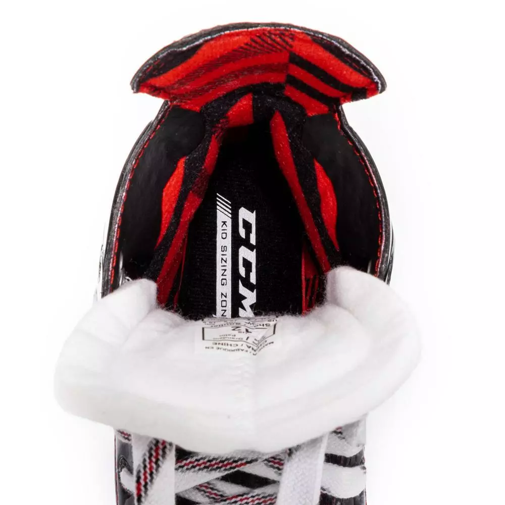 For comfort and protection CCM uses a brushed microfiber liner that prevents wear and rubbing, and a felt tongue with embossed lace bite protection. These skates have a non-replaceable Black Steel blade with an elevated holder for an increased attack angle.Â