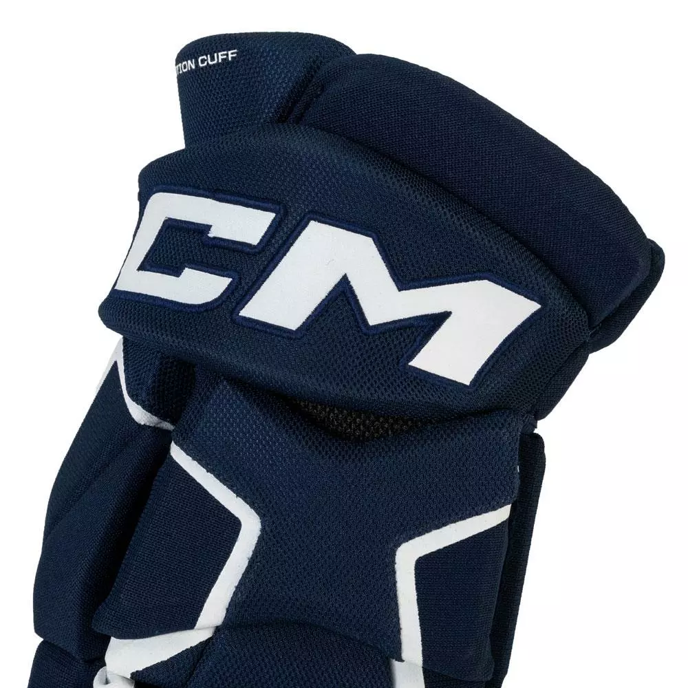 Toward the top of the glove, CCM’s top-of-the-line segmented flex motion cuff offers enhanced freedom of movement, flexibility, and added protection for your wrist. The glove construction is also improved with an anatomical shield design and the use of lightweight polyester. This high-quality material keeps the gloves light during play without sacrificing protection or durability.