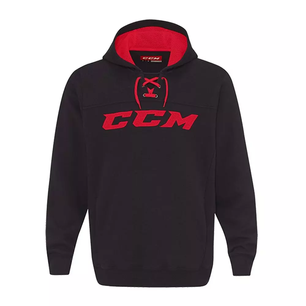 This pullover lace hockey hoody is part of the True To Hockey apparel collection by CCM. This hockey hoody features a hidden kangaroo style front pocket and a hockey jersey inspired neckline. The hood is a contrast mesh lined hood. The cuffs and waistband are ribbed for added style and texture. The contents of this hockey hoody are 70% Cotton and 30% Polyester.
